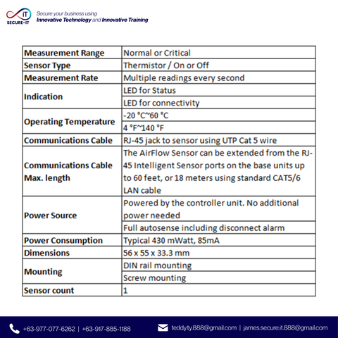 Ideal for placing in-front of air intake or exhaust fans to indicate if the airflow is sufficient and as an early warning of failures in the cooling systems or fans. The airflow sensor is a switch type on/off style sensor. It is not a precision airflow measurement sensor, but rather an indicator of whether there is a presence or absence of airflow.